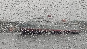 The dark blue Sunbrella “canvas” stretches over stainless steel bows to form the roof of the pilot house. When installing, we pulled it tight. A steady downpour this morning drums on the canvas with many a different cadence.