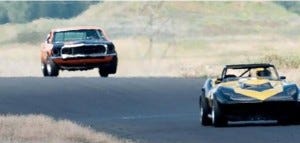 That’s not a metaphor. His Mustang has all four off the ground. We’re doing 120 mph at that point, maybe a dime more. I feel the drop, and can sometimes smell burnt rubber when my suspension bottoms out.